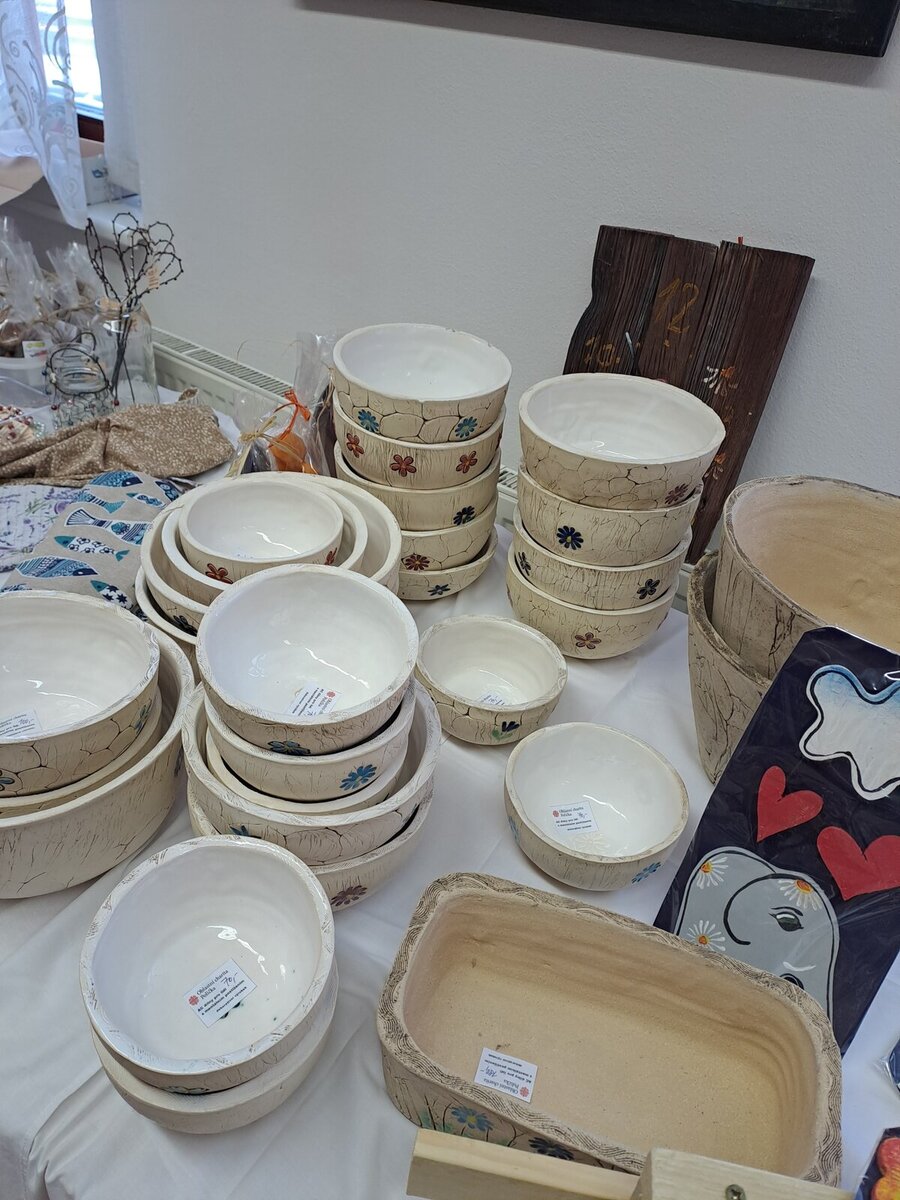 Na výstavě prodávají klienti své výrobky z AC dílen - z keramiky, dřeva, rukodělné výrobky